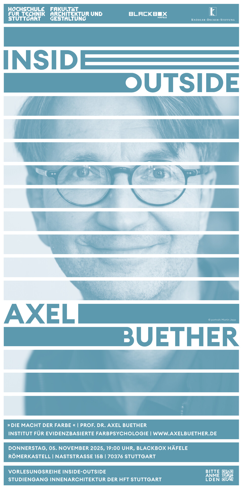 Gemeinsam mit der HFT Stuttgart, Studiengang Innenarchitektur, laden wir Sie herzlich zu einer weiteren Veranstaltung der Inside_Outside Vortragsreihe ein. Professor Axel Buether gibt als einer der führenden Farbexperten der modernen evidenzbasierten Farbpsychologie interessante Einblicke in das Spannungsfeld zwischen Psychologie, Design und Umweltgestaltung. Denn: Farbe ist kein dekorativer Nebenaspekt – sie ist ein zentrales Mittel der Selbstvergewisserung, der emotionalen Orientierung und der nonverbalen Kommunikation.